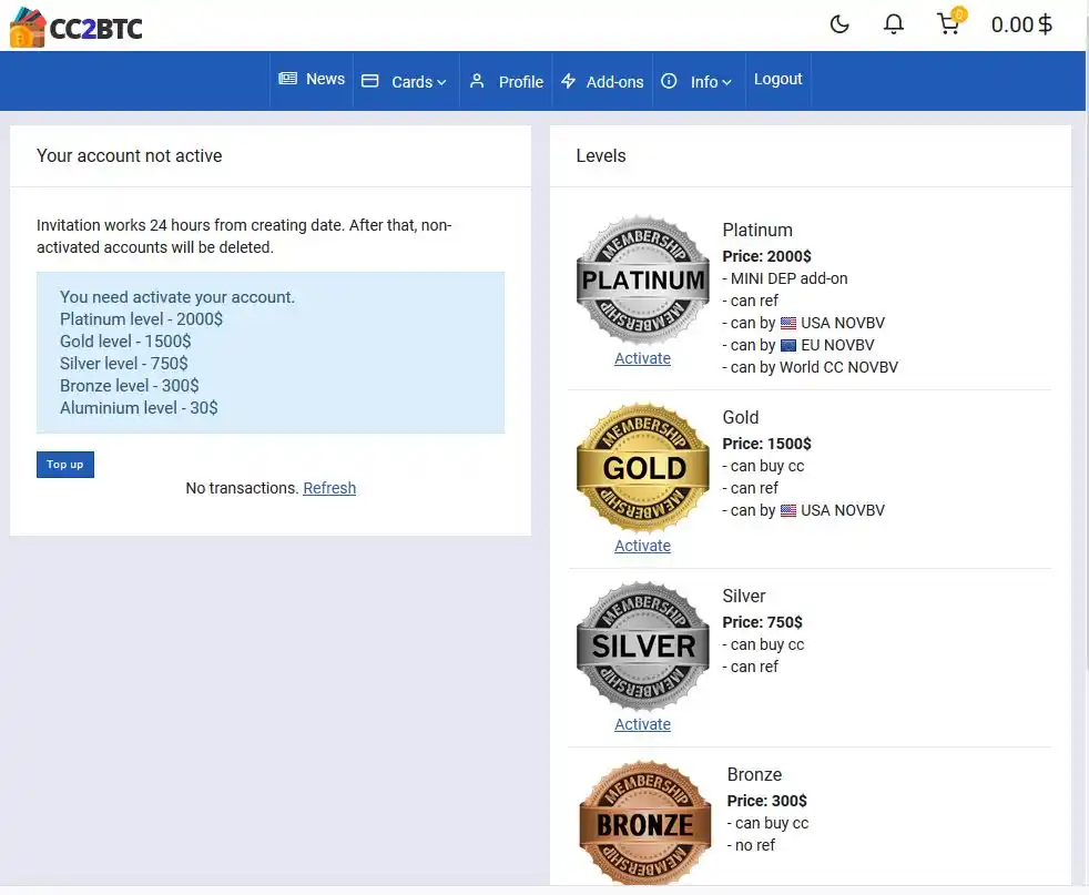 If you deposited $300 you will have access to the normal CC cards and dumps. However, to be able to access the vast pool of no-vbv cards you need to be at Gold level – that means you have to deposit $1500. But if you are interested in the no-vbv cards, the better option is to deposit $2000 or more for platinum level – this gives you full access to all cards and you can search the database by region and other attributes.