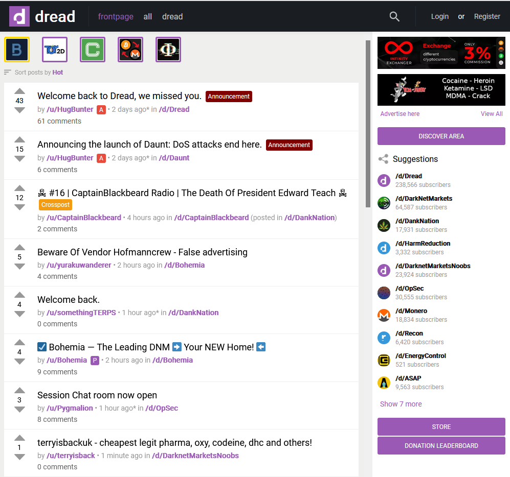 After months of downtime due to ddos attacks, the Dread darknet forum has now returned. On reddit HugBunter announced: