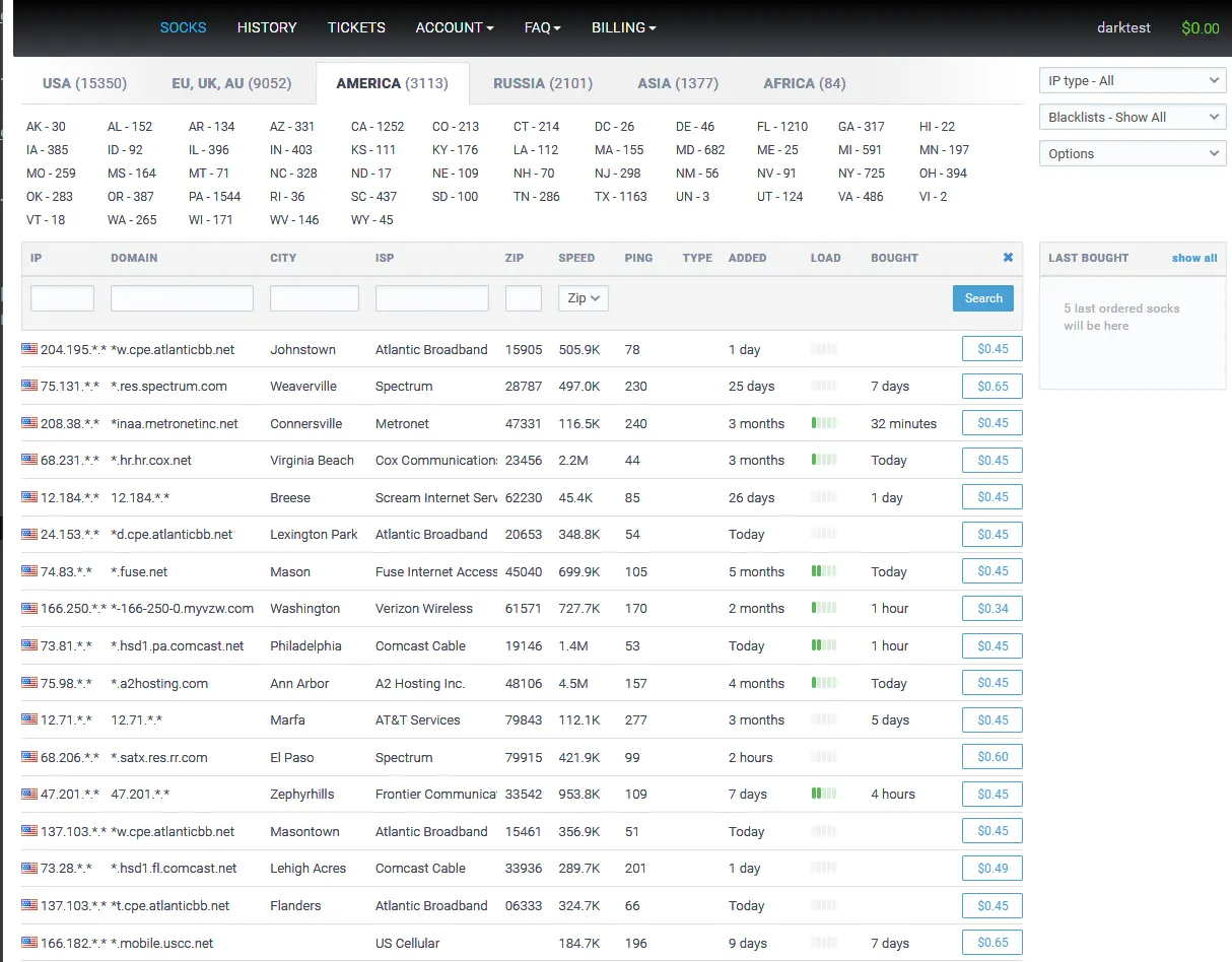 Luxsocks is a great resource if you’re looking for legitimate IP/systems for usage. Few other sites offer this vast array of different proxy servers and the interface is fast and simple. Note however, that luxsocks.ru might not work when accessing it from the Tor network – try a normal browser instead. As always, when visiting any darknet site or telegram group sure to only use trusted links, such as the onion link for Luxsocks on the top.
